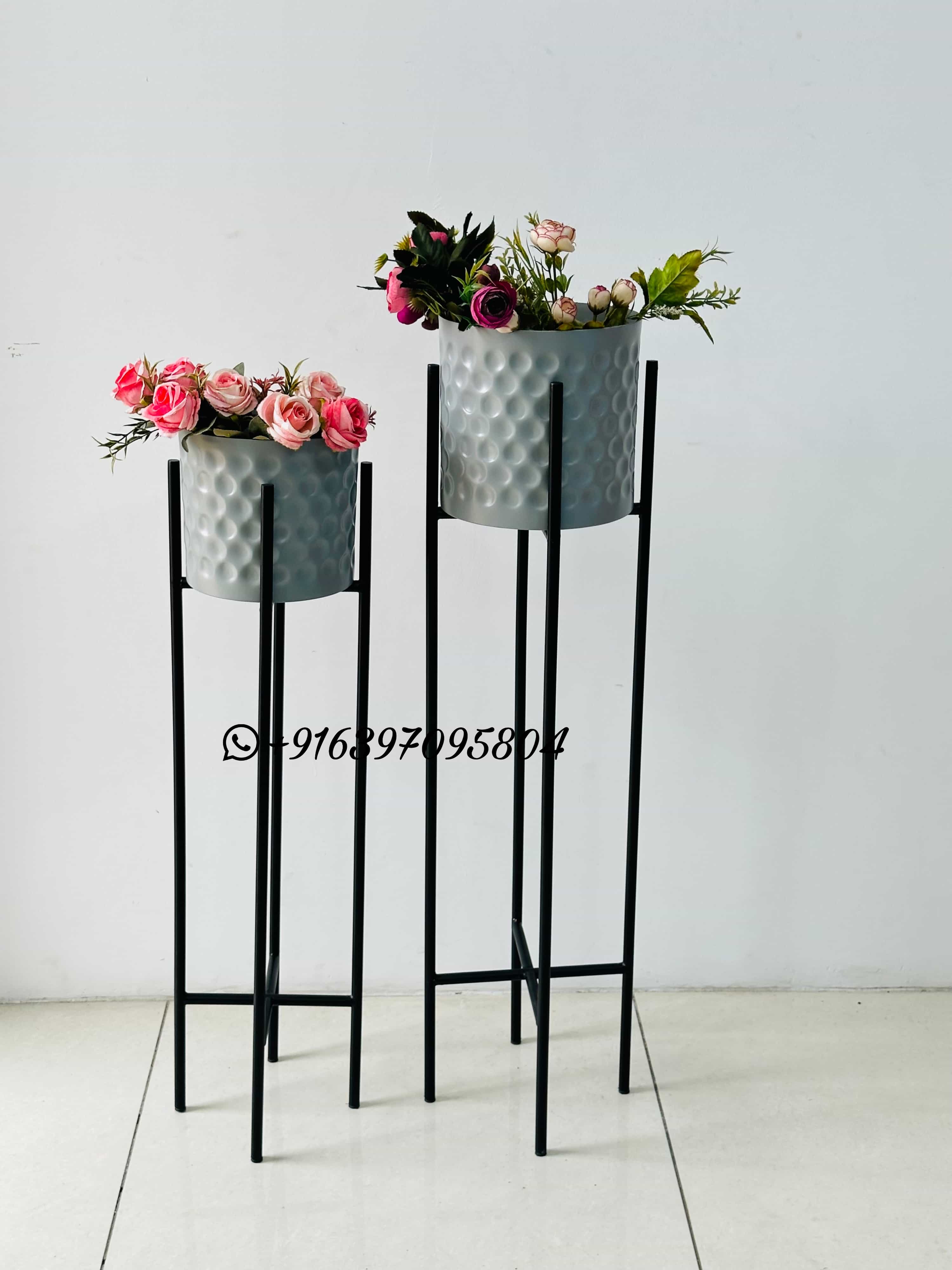 Round Hammered Grey Planter pots with matte black stands in iron with powder coated finish